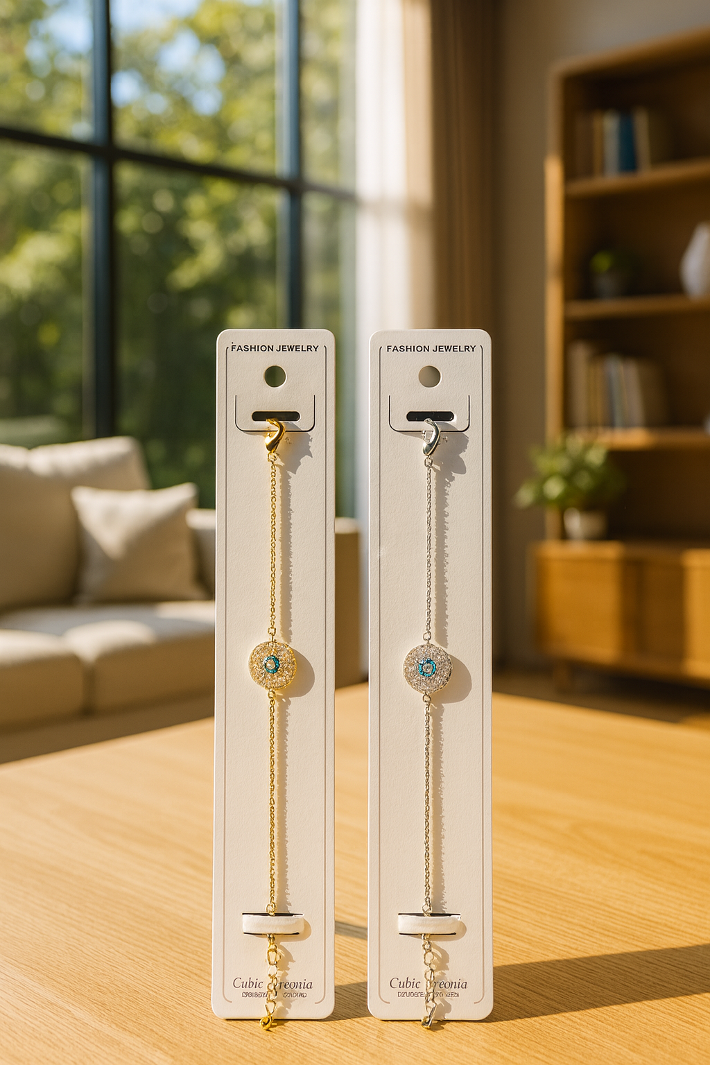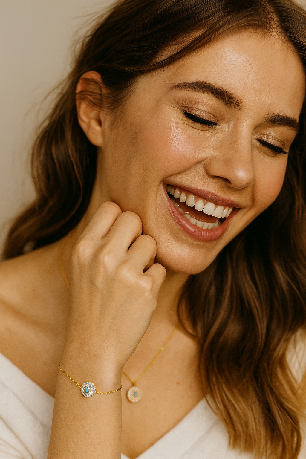 A stylish round charm with a turquoise center symbolizing protection and positivity.